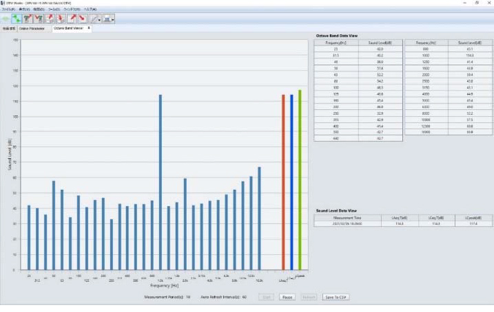 查看器显示数值数据日志、条形图和频率加权声压水平WN100