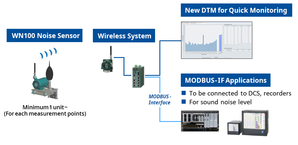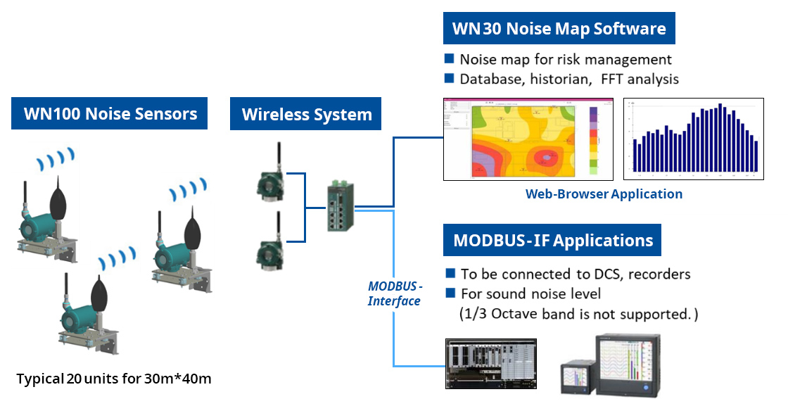 完全解决方案由两个主要构件组成一是无线声波测距仪(WN100),用ISA100无线技术防爆声波传感器,二是噪声地图软件(WN30)。WN30处理一组WN100分配区域收集的噪声数据并显示显示器上噪声图