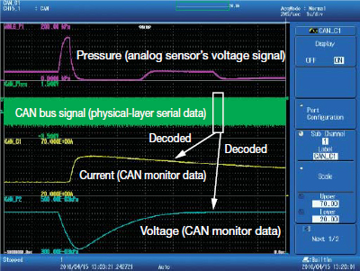 | 实例比较验证测量信号和CAN总线信号 CAN总线数据物理值和相应的测量波形同步同步举个例子,点火开关OFF信号、对应命令的CAN信号和由压力传感器测量的实际信号等可在同一屏幕上显示并检查,验证这些信号的关联性 |