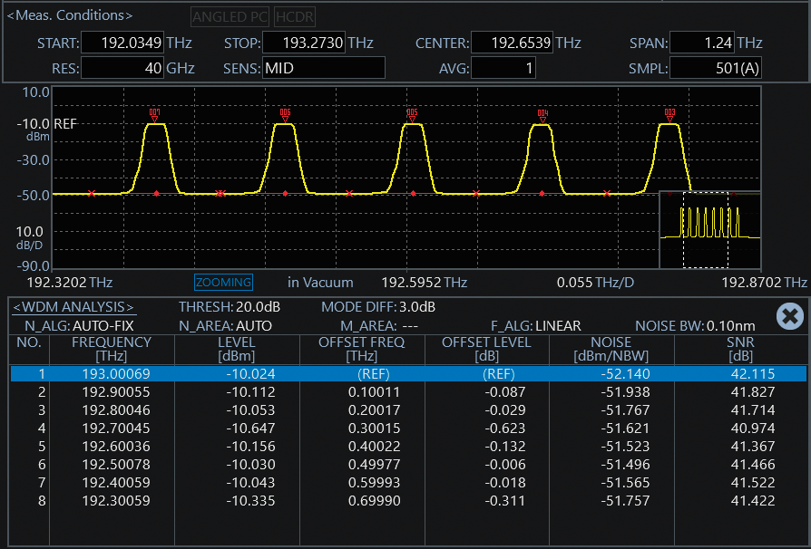AQ6370E广密动态范围允许对DWDM传输系统进行精确OSNR测量(最大达50GHz间距)。WDM内置分析函数同时分析测量波形并显示峰值波长、峰值和OSNRWD信号达1024信道